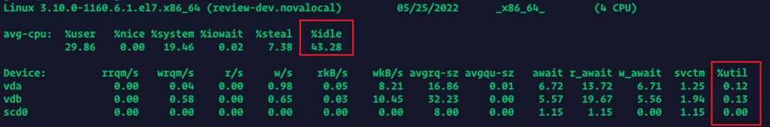 上面显示了服务器的内存使用情况:总内存16G,使用了10G左右,内存使用率62%,可以继续使用,同时关闭了Swap虚拟内存。 在下 磁盘I/O磁盘I/O指的是磁盘的读写,在软件系统中,日志、文件操作、数据库操作都会造成磁盘读写压力,其中又以数据库操作为甚,在高并发情况下往往数据库会首先成为系统的瓶颈。 磁盘监控我推荐大家使用iostat工具,可以很方便查看磁盘的使用情况。 使用iostat查看磁盘I/O首先我们需要安装