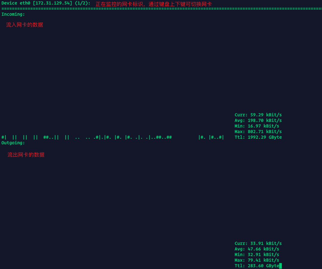 一般情况下服务器的平均负载需要小于当前服务器的CPU核数,为了应对突发状况,服务器的平均负载应该在75%即3 以下,很显然,上图这台服务器平均负载超过了75%,需要考虑提升性能了。 网络使用情况网络使用情况也是监控的重要指标。当带宽不足时会大大增加请求的响应时间。为了防止突发性并发压力,应该保证服务器的带宽使用率在80%以上。这里需要注意的是,物理网卡限制了服务器所能使用的最大宽带。 查看网络使用情况我推荐使用 使用nload查看网络首先需要安装nload,以centos为例