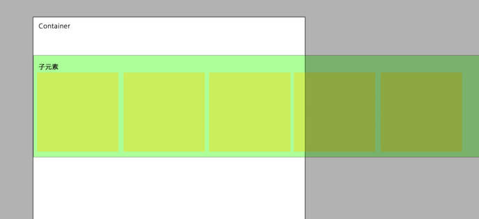 最为演示示例,我们假定页面中有一个 div 作为数据显示的容器(container),container 内有一个子元素(div),子元素的宽度大于container,我们设置container 的css 样式:overflow: hidden; 如下图: