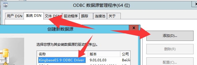 控制面板-管理工具-ODBC数据源64位-系统DSN-添加人大金仓的连接信息