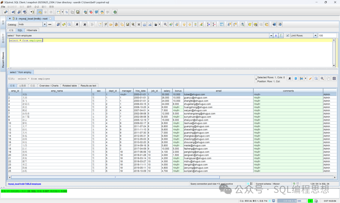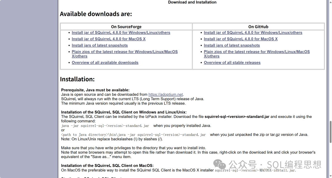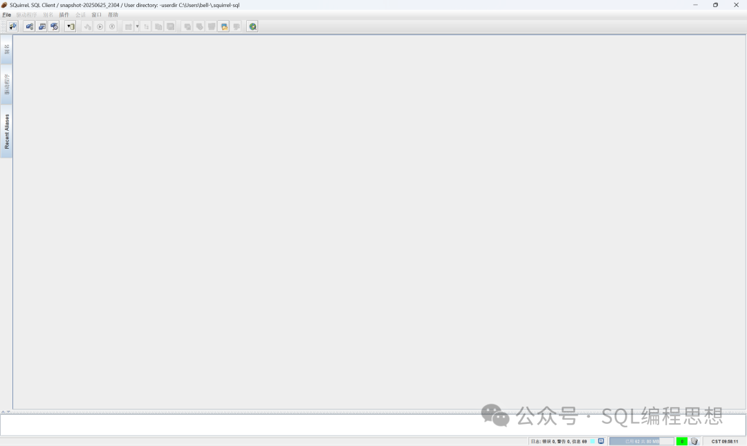 SQuirreL SQL 是一个免费开源、基于 Java 的 通用 SQL 客户端。它提供了一个统一的界面,让数据库管理员(DBA)、开发人员和分析师能够轻松地连接、查询和管理多种不同类型的关系型数据库。 SQuirreL SQL 支持 Windows、Linux、macOS 操作系统。 数据库支持SQuirreL SQL 最大的优势之一是它通过加载相应的 JDBC 驱动程序来连接数据库,因此只要数据库提供 JDBC 驱动,理论上就可以通过它进行连接。 常见的数据库包括 PostgreSQL、MySQL、MariaDB、Oracle、Microsoft SQL Server、 Db2、SQLite、H2、HSQLDB、Apache Derby、Firebird、Sybase ASE、Informix、 Amazon Redshift,、Snowflake、Apache Hive、Apache Impala、Vertica、Teradata 等。 对象浏览器:SQuirreL SQL 以树形结构直观地浏览连接的数据库对象:数据库、表、视图、存储过程、函数、序列、索引、触发器等。 右键菜单提供常用操作:查看数据、生成 SELECT/DROP/CREATE 脚本、重命名、导入/导出数据等。 SQL 编辑器SQuirreL SQL 编辑器支持语法高亮(多种数据库方言)、代码自动补全(对象名、关键字、函数)、执行 SQL 语句或脚本、查看执行计划(EXPLAIN)、查询结果分页显示、查询结果导出(CSV、Excel、XML、JSON、SQL)、查询历史记录等功能。 扩展插件SQuirreL SQL 实现了一个插件系统,支持通过插件扩展功能,例如 Graph Plugin 可以构建数据库实体关系图,并且可以通过图形化的方式创建查询语句。 其他常用的插件包括数据导入、数据复制、Hibernate 脚本、跨数据库查询、SQL 标签以及各种特定数据库扩展功能等。 下载安装SQuirreL SQL 基于 Java 运行环境,使用以下命令验证是否安装 Java: