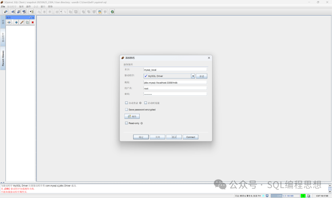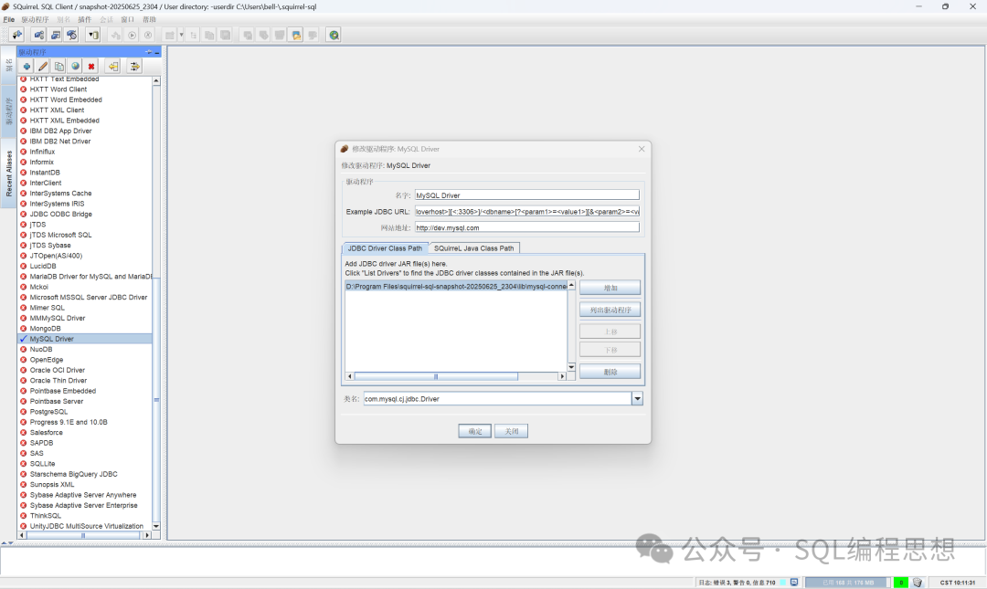 输入以下网址打开官方下载页面: https://squirrel-sql.sourceforge.io/index.php?page=home#installation 选择对应的操作系统和软件版本(稳定版或者快照版)进行下载。然后双击下载的 jar 文件进行安装: 在安装页面可以勾选各种数据库扩展插件和中文语言支持。 安装完成后执行 squirrel-sql.bat(Windows)或者 squirrel-sql.sh(Linux、macOS)脚本启动程序: 连接数据库下面我们以 MySQL 为例介绍如何连接数据库。 首先,点击页面左侧“驱动程序”标签,找到 MySQL Driver 配置: 然后添加 MySQL 数据库的 JDBC 驱动文件路径(官网可以下载),点击“列出驱动程序”按钮,最后点击“确认”完成驱动配置。 接下来通过别名连接到一个 MySQL 服务器,选择页面左侧的“别名”标签,点击“+”新建别名(连接): 输入 JDBC 连接串,点击“测试”进行验证,点击“确定”进行保存,或者直接点击“Connect”进行连接: 接下来就是数据库开发和编写 SQL 语句了。 阅读原文:https://mp.weixin.qq.com/s/6oD7pxlEIO08niGM7aP0cQ 该文章在 2025/7/1 21:06:42 编辑过 |