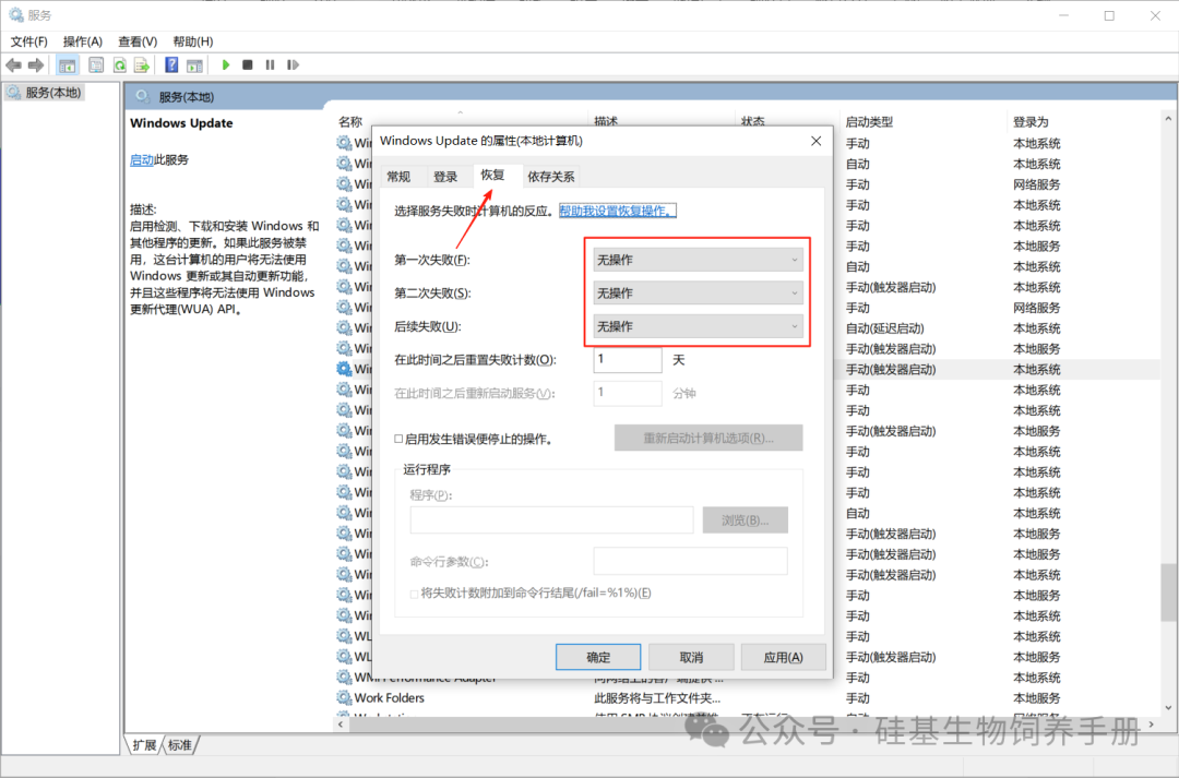 3. 切换到【恢复】选项卡,将“第一次失败”“第二次失败”“后续失败”都设置为【无操作】,点击【应用】并【确定】