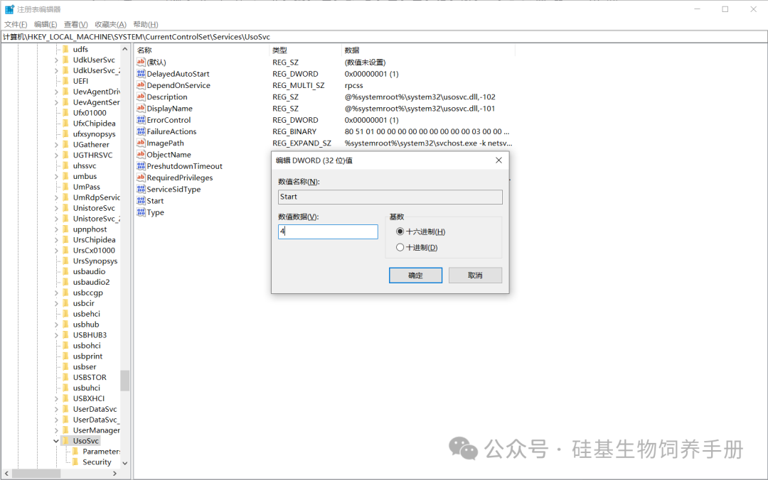 3. 找到【Start】项,双击将16进制值修改为【4】(禁用)