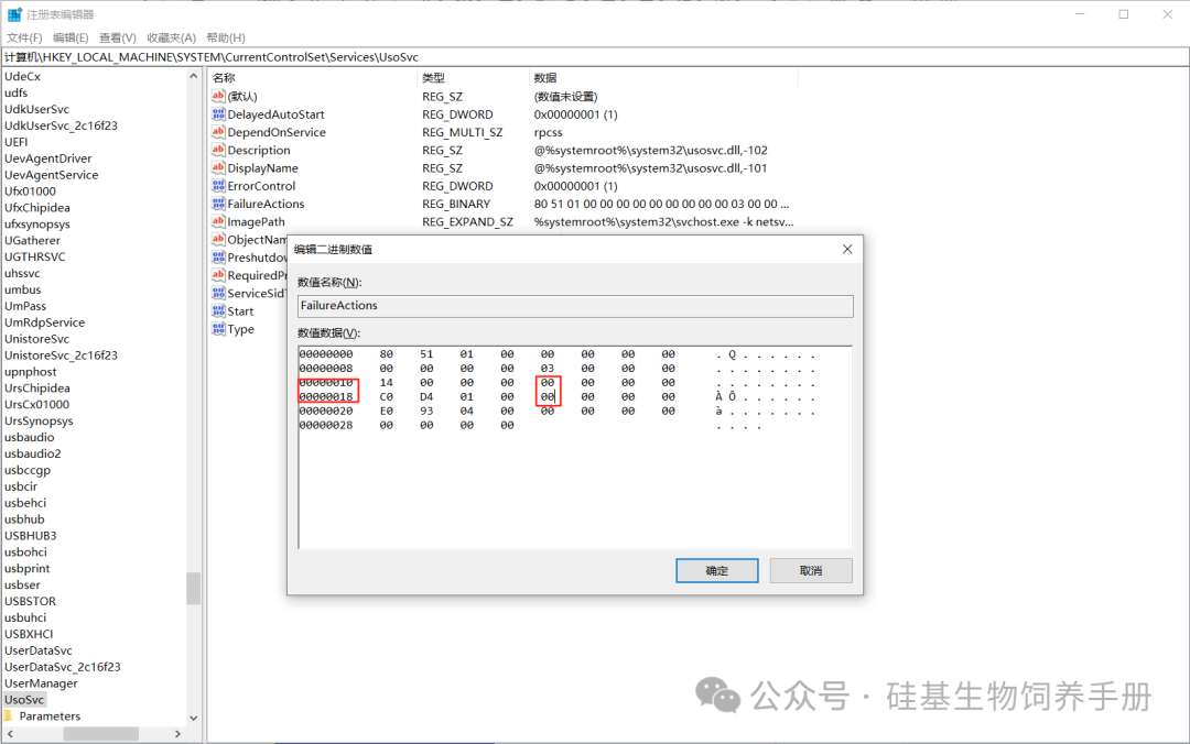 4. 找到【FailureActions】,双击修改内容,将“0010”“0018”行的第5个数字从 "01" 改为 "00",防止失败后自动重启恢复服务