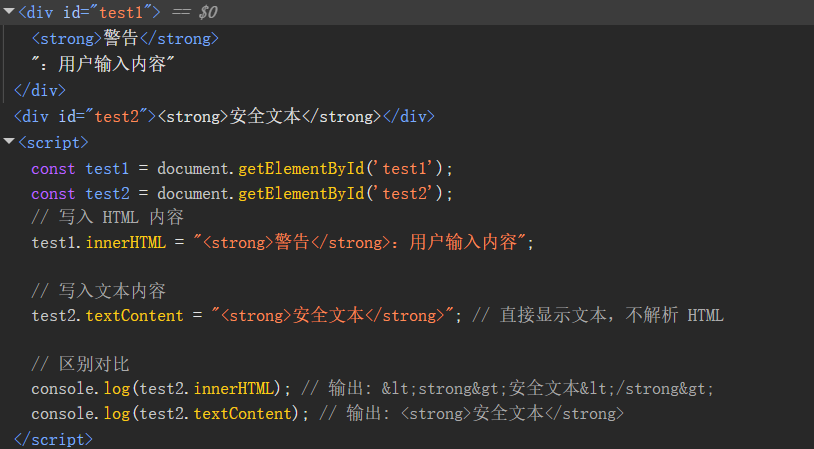 console.log(test2.innerHTML); // 输出: &lt;strong&gt;安全文本&lt;/strong&gt;