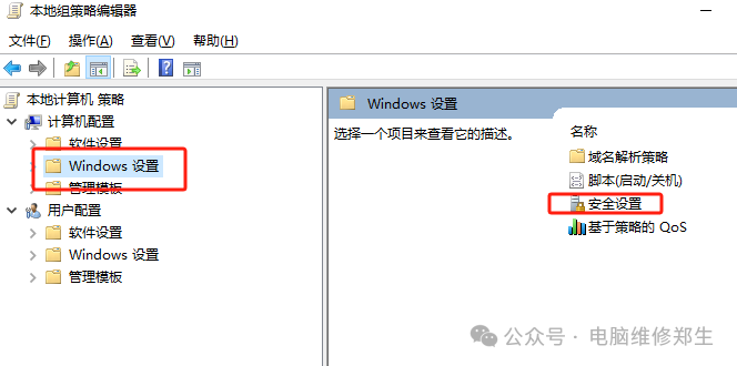 紧接着,在弹出的这个窗口中,我们依次打开“本地计算机策略”。在下拉菜单中找到“windows设置“,然后双击将其打开。在窗口的右侧,我们找到“安全设置”这一选项。