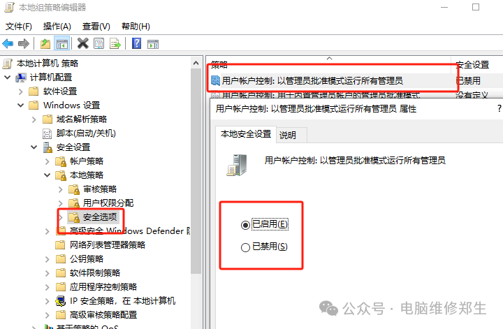 随后,我们下拉找到“本地策略”,再双击“安全选项”。在找开的安全页面中,往下拉,我们找到了“用户账户控制:以管理员批准模式运行所有管理员”这个选项。