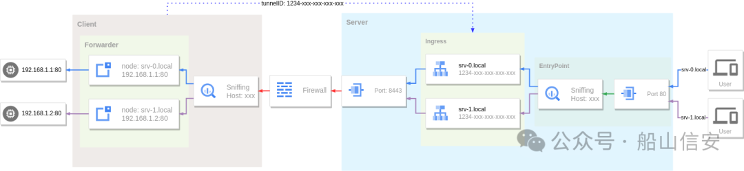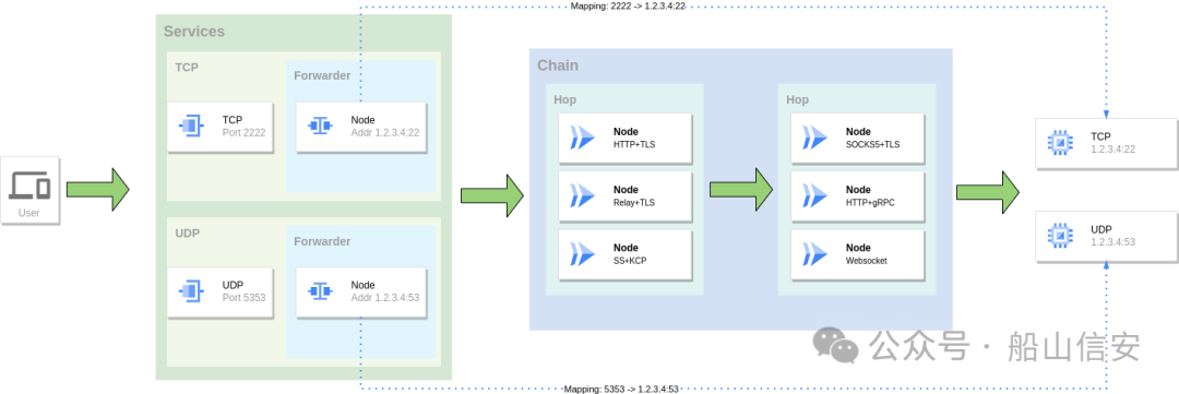 将一个服务的端口映射到另外一个服务的端口,同样可以组合使用多种协议组成转发链进行转发。