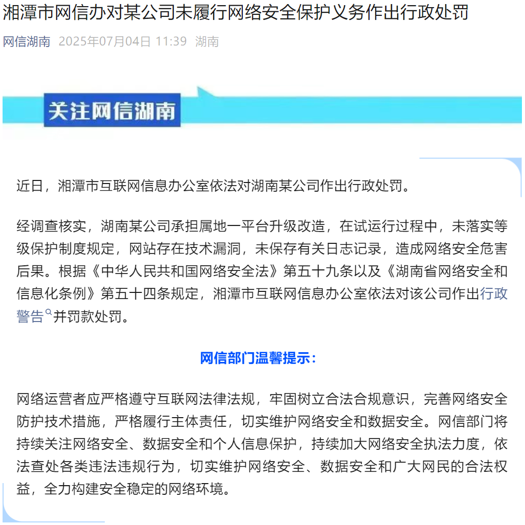 202574【网信湖南】公众号通报了一起网络安全事件:湖南某公司在承担属地一平台的升级改造过程中,未落实网络安全等级保护制度,导致系统存在严重技术漏洞,且未保存必要的日志记录,在试运行期间造成了网络安全危害。根据《中华人民共和国网络安全法》第五十九条及《湖南省网络安全和信息化条例》第五十四条的规定,湘潭市互联网信息办公室依法对该公司作出行政警告和罚款的处罚。这一事件再次警示我们:系统上线前必须严格落实等级保护制度,确保安全防护到位,决不能“带病上线、带病工作”。