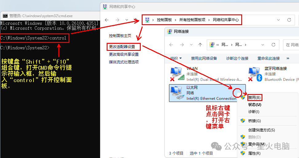 然而,如不方便拔网线,也可以通过网络共享中心的“更改适配器设置”禁用网卡,效果一样。