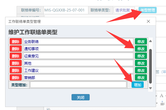 管理员可在发送工作联络单页面点击类型管理按钮维护类型,类型用于联络单分类查询。