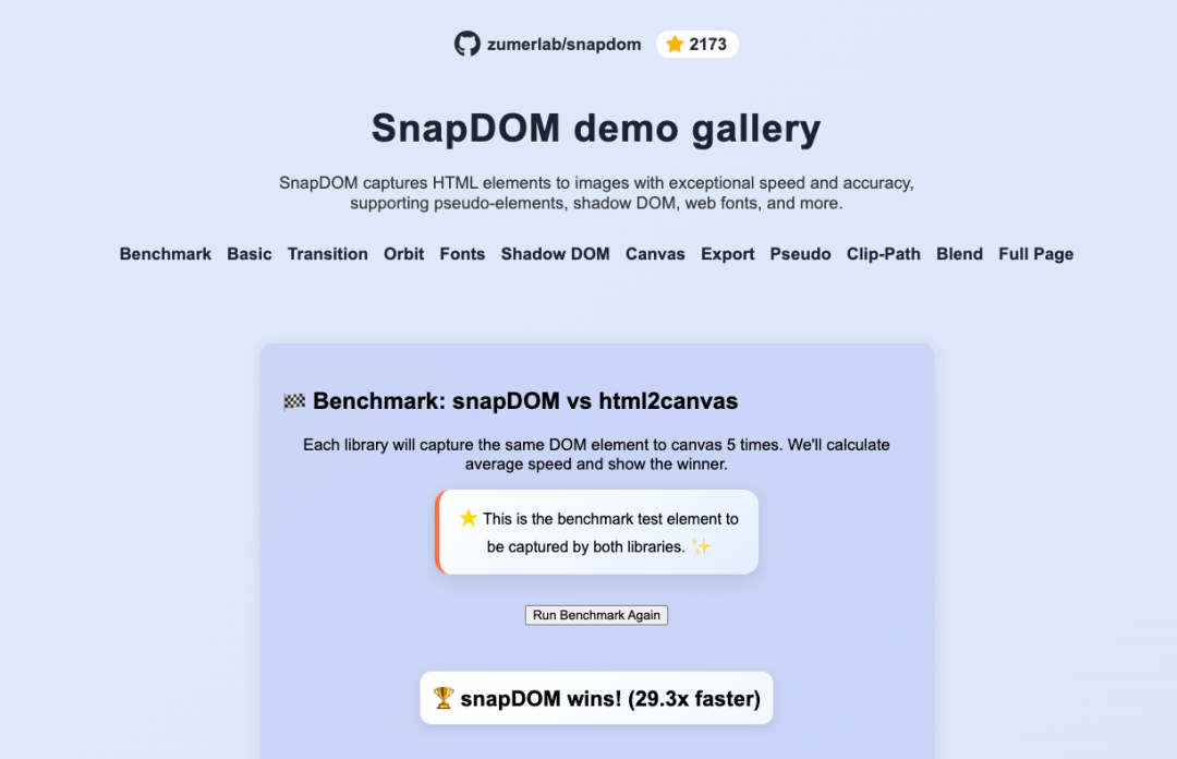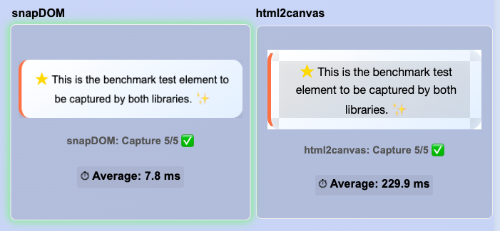 测试数据显示,在不同场景下,SnapDOM 都把 html2canvas 和 dom-to-image 这俩老前辈远远甩在身后。