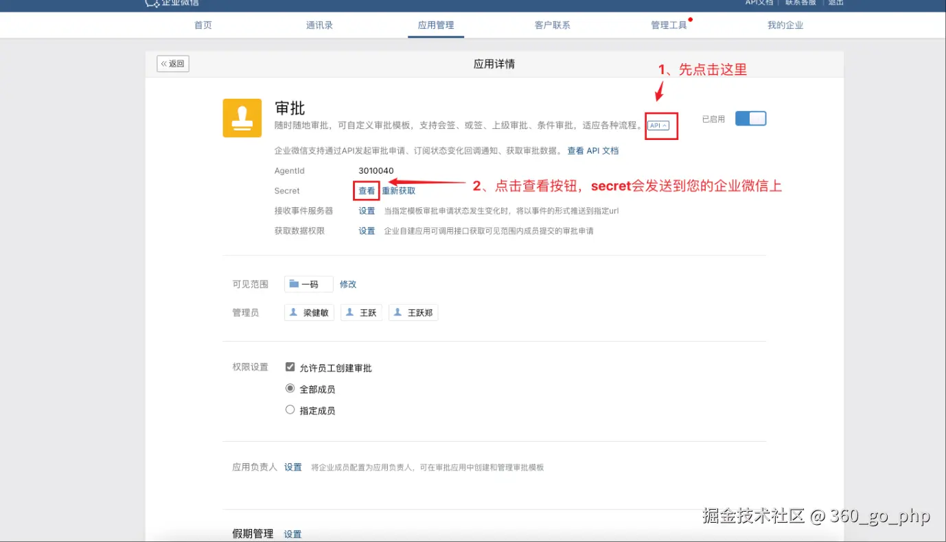- 在企微后台,配置审批API时需要选择正确的应用ID和权限范围。