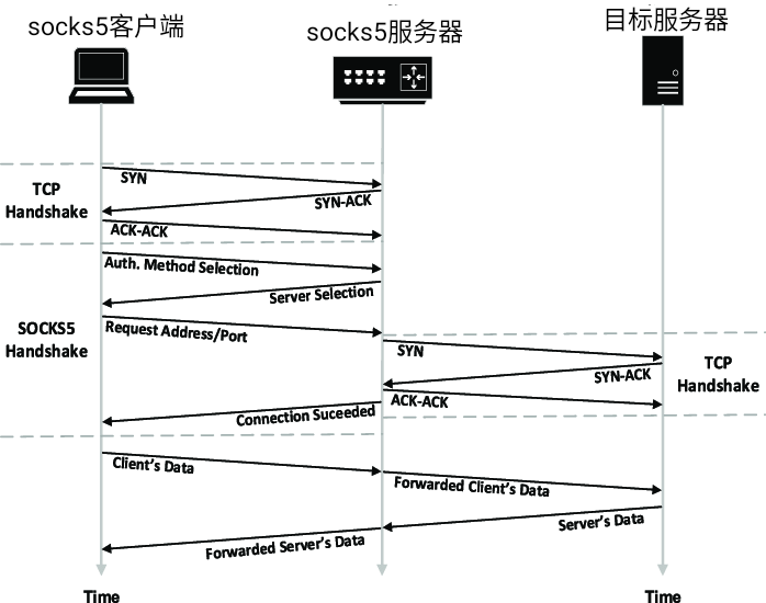1. Socks5协议 Socks5是Socks协议的第五个版本,在Socks4的基础上新增UDP转发和认证功能,是互联网上最典型的一个网络代理协议,它的基本工作原理如下图所示: 图片来源网络 1) 首先Socks5客户端与Socks5服务器TCP三次握手建立一条TCP连接。 2) 然后执行Socks5握手,协商协议版本号、支持的认证方法,对Socks5客户端进行认证(如果配置了验证)。 3) Socks5协商和认证成功后,当用户通过应用程序访问特定网络资源时,Socks5客户端监听并截获到应用程序的访问请求,然后向Socks5服务器发起连接请求。请求的内容包括,应用程序要访问的目标服务器ip地址或域名和端口等信息。 4) 收到客户端的连接请求后,Socks5服务器和目标服务器进行TCP三次握手建立TCP连接。然后向Socks5客户端发送一条Socks5响应消息,通知对方到目标服务器的连接已经建立成功。 5) Socks5客户端将收到的来自应用程序的数据(可能是应用层的数据,也可能是传输层之上的数据,譬如SSL协议报文)通过1)所建立的TCP连接原样发送给Socks5服务器;Socks5服务器再将数据通过4)建立的TCP连接原样发送给目标服务器;目标服务器收到应用程序的数据后,反向将响应数据发送给用户端的应用程序。