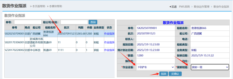 进入界面后,选中单据-选择作业设置,装卸班组,再点击“指派”按钮