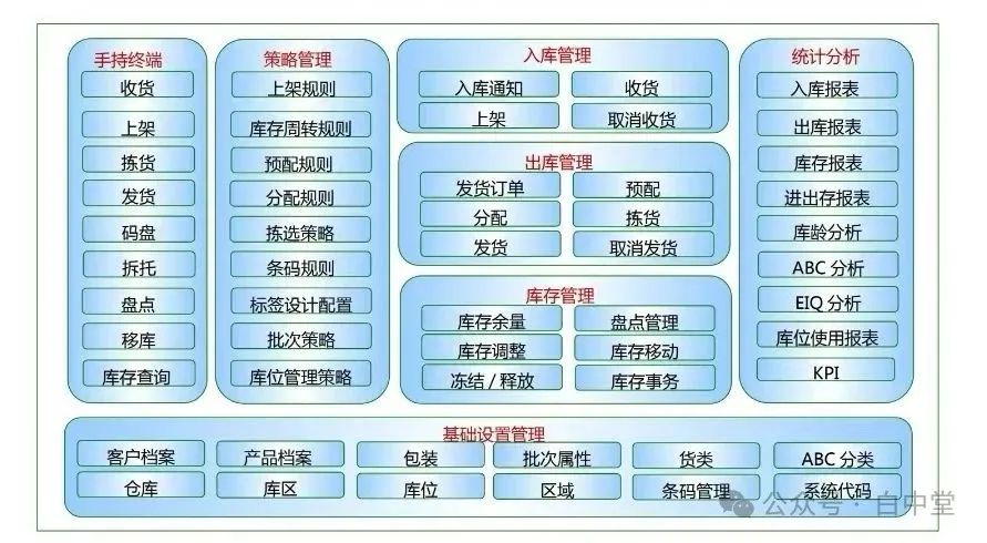 WMS系统管理所有实体货物流转出入,任何有实际货物的搬运、移动的库存作业都要记录。 用两幅图来概要,图一为系统框架图(含外部系统集成): ![]() 图2为系统功能概要: ![]() 一、WMS 核心功能框架 1.1. 核心作业管理(收发转盘存) 入库管理 - 收货(扫码/手动录入) - 上架(库位分配、实物放置) - 入库通知(接收上游系统指令) 出库管理 - 拣货(按订单/批次拣选) - 发货(装箱、复核、出库确认) - 发货订单处理 - 分配(订单与库存匹配) 库存管理 - 调拨(库位间调拨) - 移库(库位内调整) -盘点(周期盘点/动态盘点) - 库存调整(数量修正) - 冻结/释放(锁定异常库存) - 码盘/折托(托盘管理) 库存查询:实时查看库位余量、批次信息