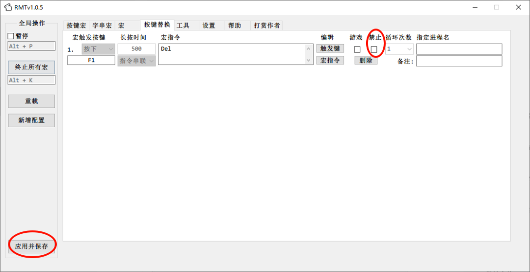 然后有个需要注意的点,就是当你设置完成后,软件默认这条设置是禁止状态,我们需要把禁止状态取消后,点击应用并保存才能生效。