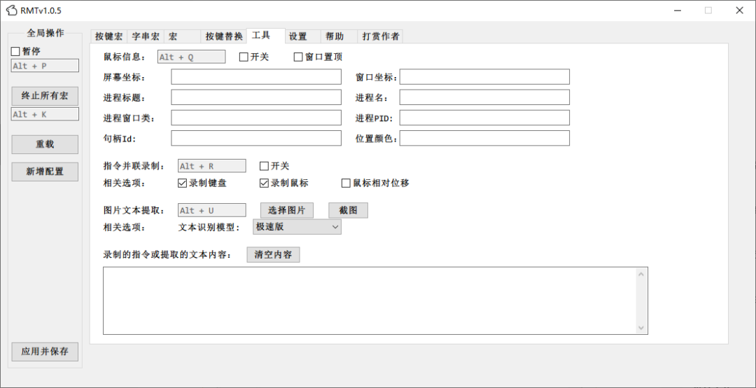 这是一款基于 AutoHotkey v2 的免费开源按键宏工具,旨在让用户通过简单的配置即可实现多种自动化操作。该工具支持按键宏、鼠标宏以及手柄宏的录制和播放,并集成了图片识别、颜色识别和文本识别等多种功能,能够满足从游戏辅助到提升办公效率的多种需求。无论是需要重复性操作的任务,还是复杂的交互流程,RMT 都可以通过一键化的方式轻松处理,让你的工作和娱乐变得更加轻松和高效。把这个任务交给代码,那么我就可以去做更有意义的事情了!