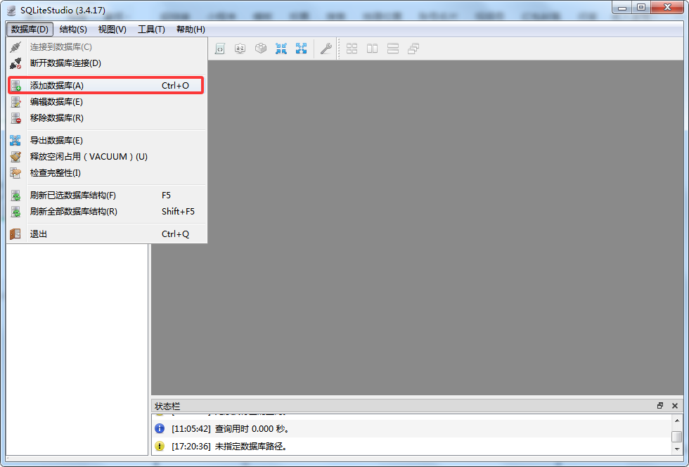 打开SQLiteStudio界面,选择<数据库><添加数据库>如下图所示选择刚刚已经创建数据库的文件夹,选择test.db数据库,点击<测试连接>OK即可,如下图所示:然后可以双击数据库,进行下一步一系列的操作即可,可以直接添加数据,修改约束等操作,如下图所示: