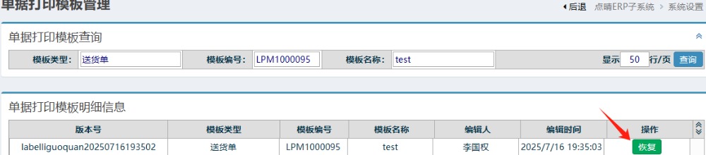 :点晴ERP-标签模板恢复历史记录模板功能-操作流程
