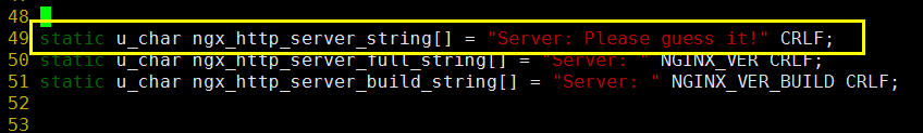 static u_char ngx_http_server_string[] = "Server: Please guess it!" CRLF; #Server后写上你自定义的服务器信息