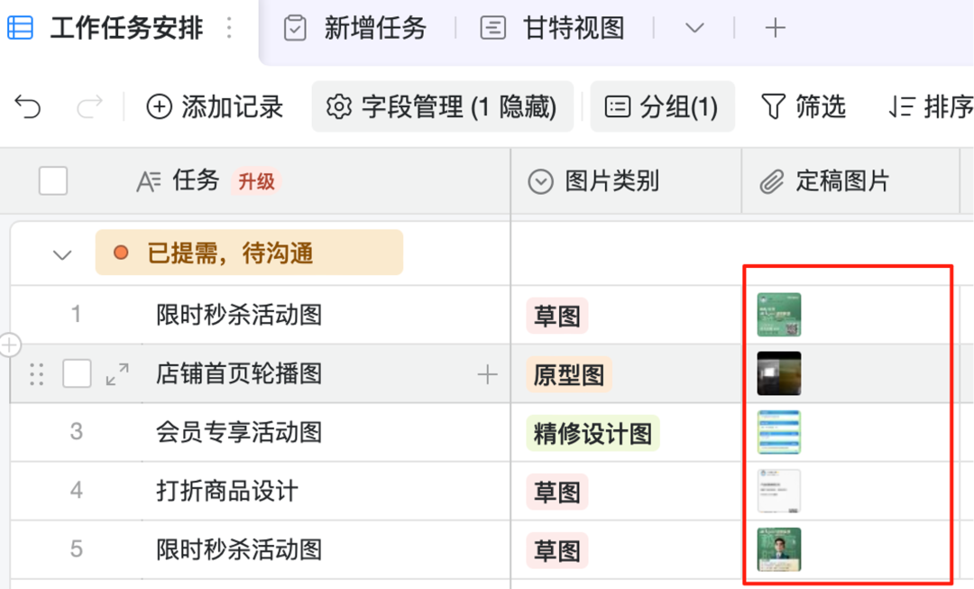 比如,在下面的 AI 表格中,每一张“定稿图片”都有对应的“设计任务”、“图片类别“等,相当于一开始就被打好了标签,AI 理解和处理就会更加精准。