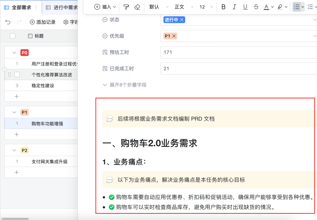 如下图,针对“购物车功能增强”这个项目任务行,可以直接打开成为一个独立的文档,然后用户就可以“像编辑word文档一样”详细记录用户需求。