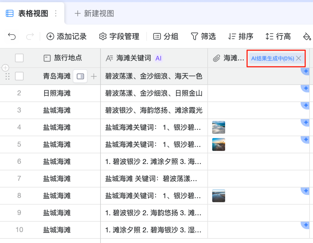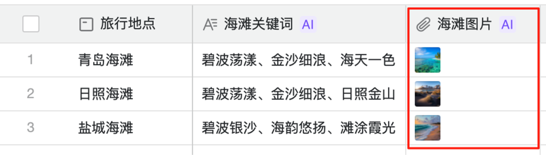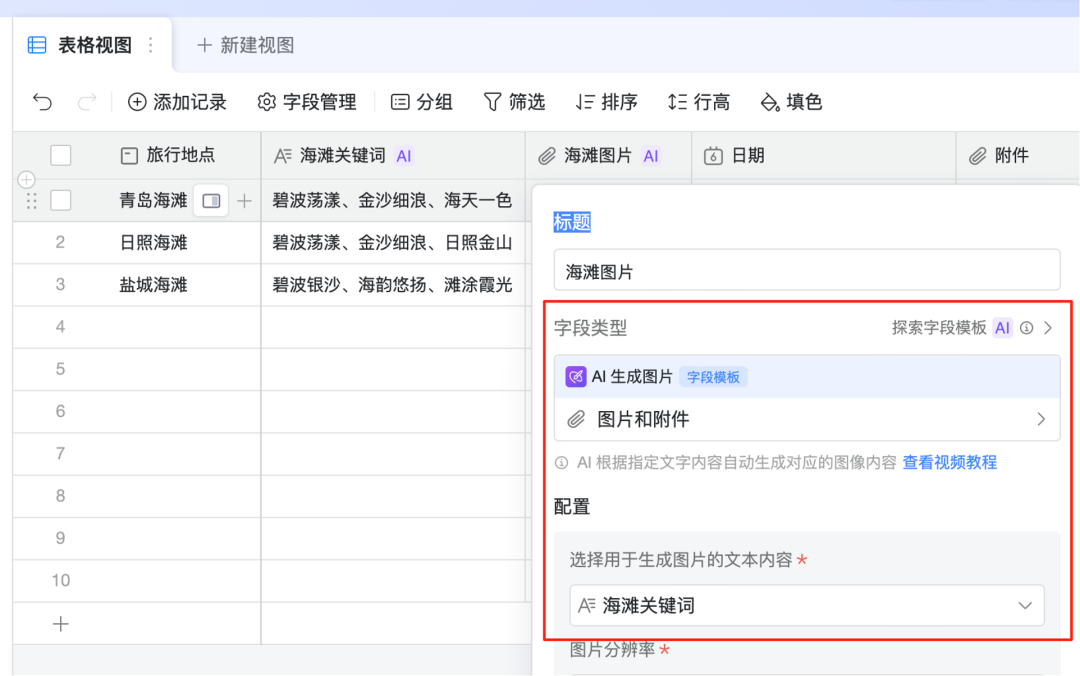 举个例子,在 AI 表格中,我可以给任何一个字段赋予 AI 能力。比如,在下面的表格中,如果要根据“海滩关键词“生成图片,只需要选择生成图片的 AI 能力,再选择用于生成图片的本文内容即可,操作非常简单。