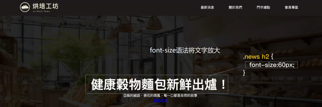 .news h2 {              /* 选择所有在.news类元素内的<h2>标题 */    font-size:60px;      /* 设置字体大小为60像素(超大标题) */}