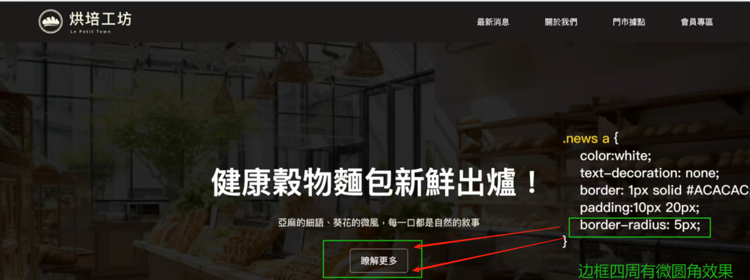 .news a {                    /* 选择所有在.news类元素内的超链接(<a>标签) */    color: white;              /* 设置链接文字颜色为纯白色 */    text-decoration: none;    /* 去除链接默认的下划线效果 */    border1px solid #ACACAC/* 添加1像素宽、浅灰色(#ACACAC)的实线边框 */    padding10px 20px;        /* 设置内边距:上下各10px,左右各20px */    border-radius5px;        /* 为元素添加5px的圆角效果 */}
