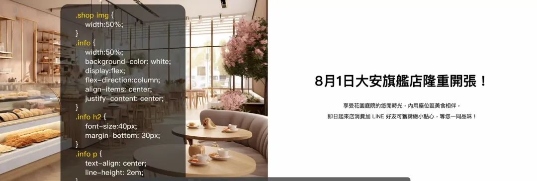 当你用Flexbox轻松实现导航栏、卡片流之后,是否遇到这样的场景:左侧需要展示精美环境图,右侧要放置活动文案? 这类「图文左右分列」布局正是商业网站的高频需求!今天我们就用Flexbox的延伸技巧,实现像示例中咖啡店宣传页一样的颜值+信息量双赢设计👇 你将掌握: ✅ 精准控制图文左右/上下排列逻辑 ✅ 自适应留白技巧(告别拥挤版面) ✅ 多区块元素同步对齐的工业级方案 左右分栏设计依然用flexbox来制作,但是我们需注意到,上图版面的的section中,有3个区块元素:<img>、<h2>、<p>
