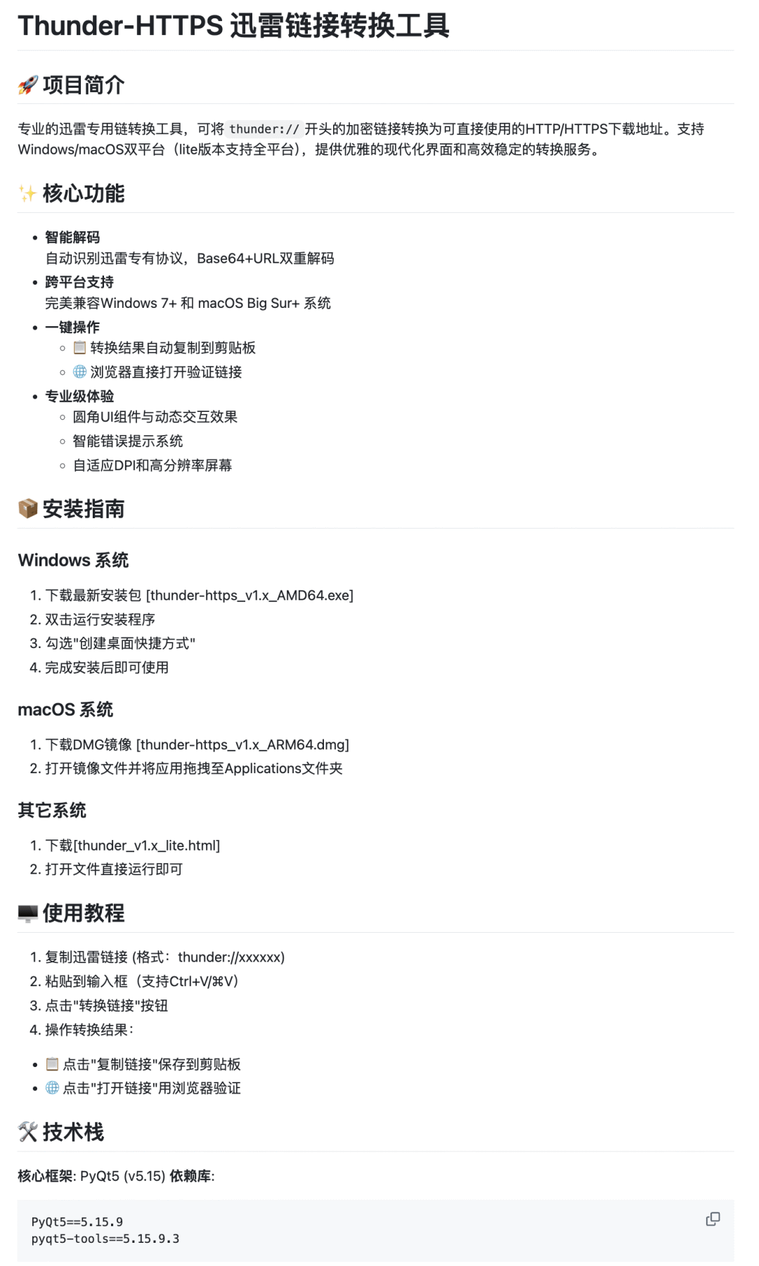 Thunder-HTTPS 是一款由开发者 helloworldpxy 制作的开源工具,能将迅雷的加密链接(thunder://)一键转换为可直接使用的 HTTP/HTTPS 下载地址。支持 Windows 和 macOS 双平台(Lite 版本支持全平台)。
