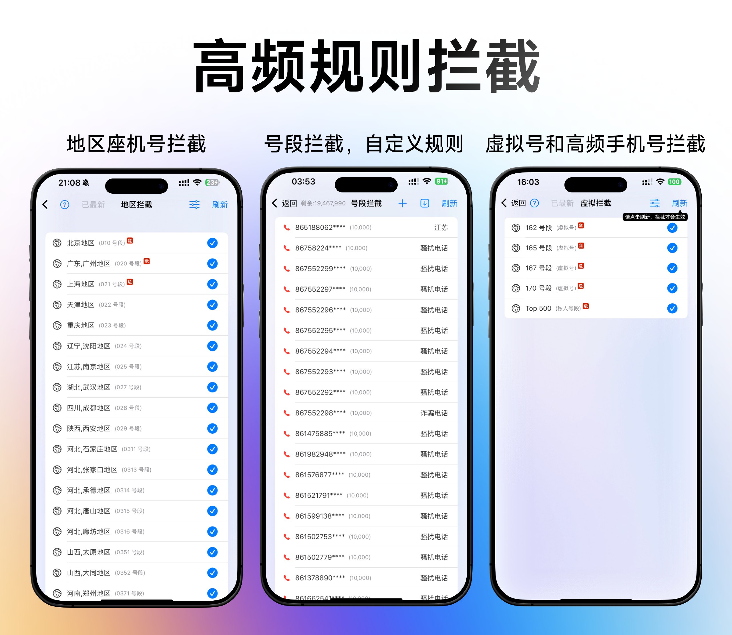 • 号段 & 自定义规则: 支持号码段多维度规则拦截