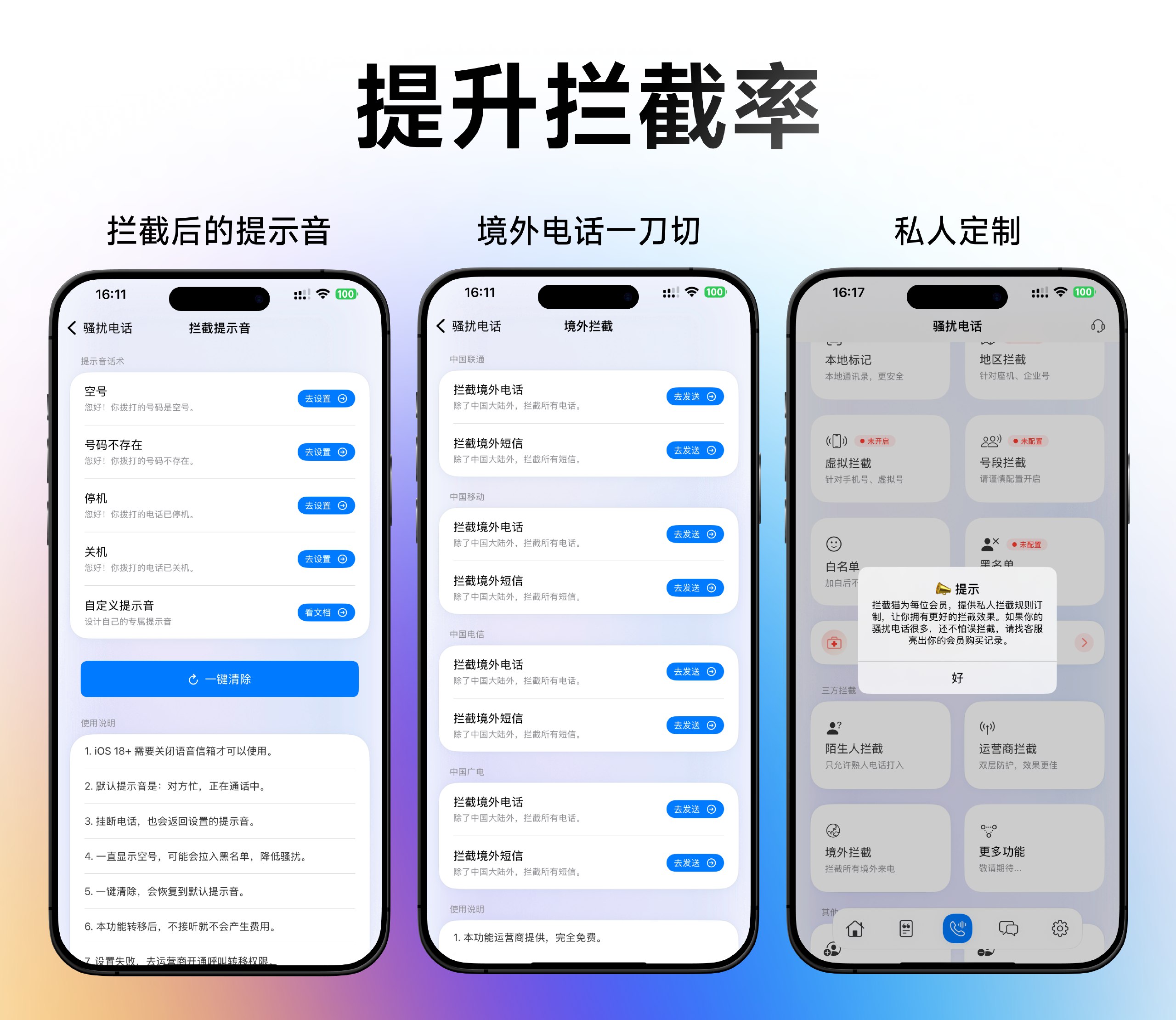 • 拦截提示音: 设置“空号”、“停机”反馈,显著降低骚扰拨打