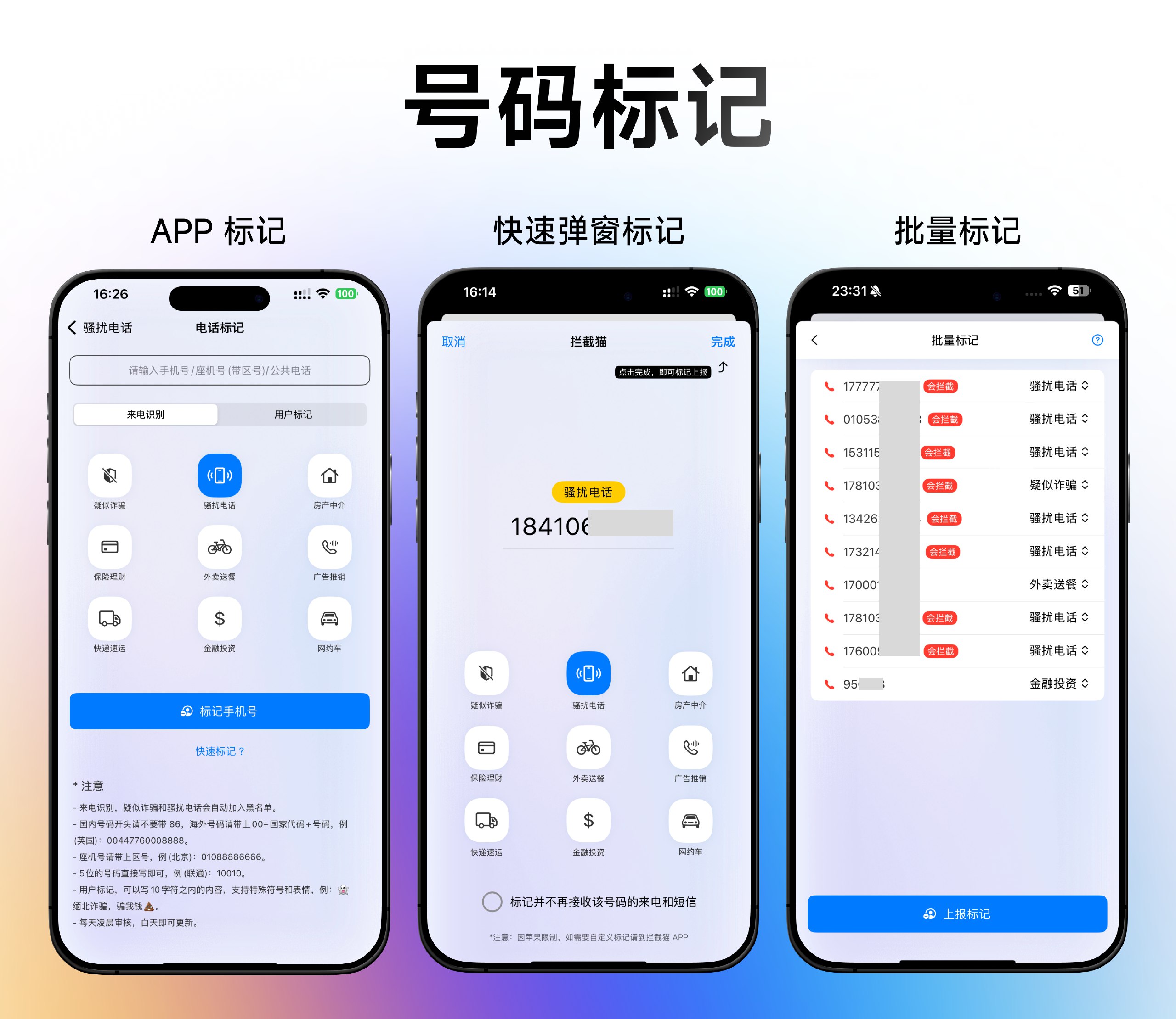 • 批量标记 (独家创新): 来电界面一键全部上报