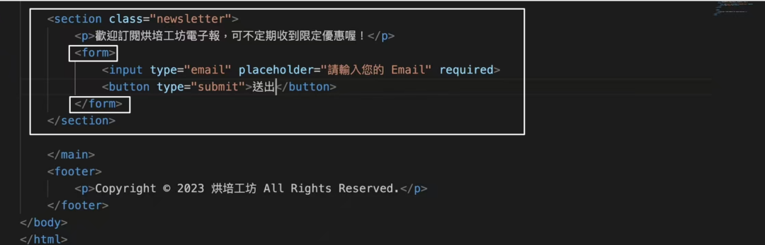 html实操示例 那今天假设我们要在页尾,也就是<footer>标签上方,设计一个表单,用以收集用户的email信息。我们一起来看看该如何操作吧。 1.首先我们在<footer>标签上方新建一个<section>,class命名为"newsletter"(此处同样,可按照个人习惯命名) 2.在<section>内,新建一个<form>标签 3.在<form>表单标签内,插入<input>标签 示例代码: 示例代码解析: