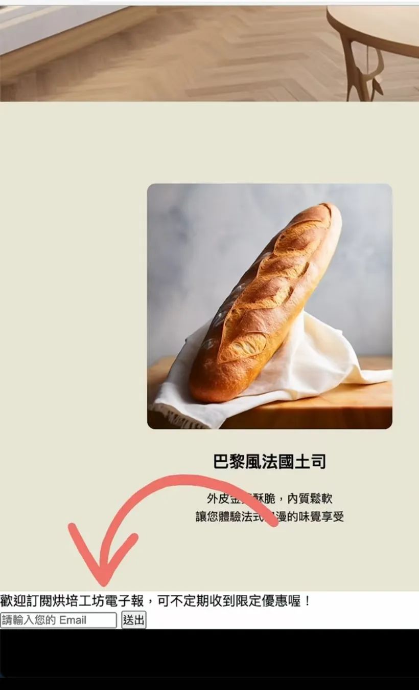 主要模块 • 电子报订阅区块 (section#newsletter) ◦ 包含标题说明(<p>标签的中文提示) ◦ 表单(<form>)含两个核心元素: ▪ 邮箱输入框:<input type="email"> 限制用户只能输入有效邮箱格式 ▪ 提交按钮:<button type="submit"> 触发表单数据提交 注意:上述表单未定义action(数据提交地址)和method(GET/POST请求方式),提交后无法处理数据。 (由于我们当前处于零基础新手阶段,只先对前端设计部分做一个大致的了解。至于表单提交后如何与后台服务器做互动,我们这里就先暂且省略了。) 此时我们的表单栏框架已通过html搭建好 框架目前是很粗糙的,接下来就又到了CSS的美化环节啦。 CSS美化部分 整体功能解析