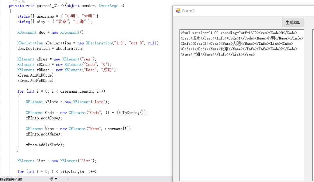 核心组件:LINQ to XML (System.Xml.Linq)辅助组件:System.Xml, System.IO一.创建一个C#窗台程序用来演示C#操作XML,生成XML格式数据<?xml version="1.0"?>