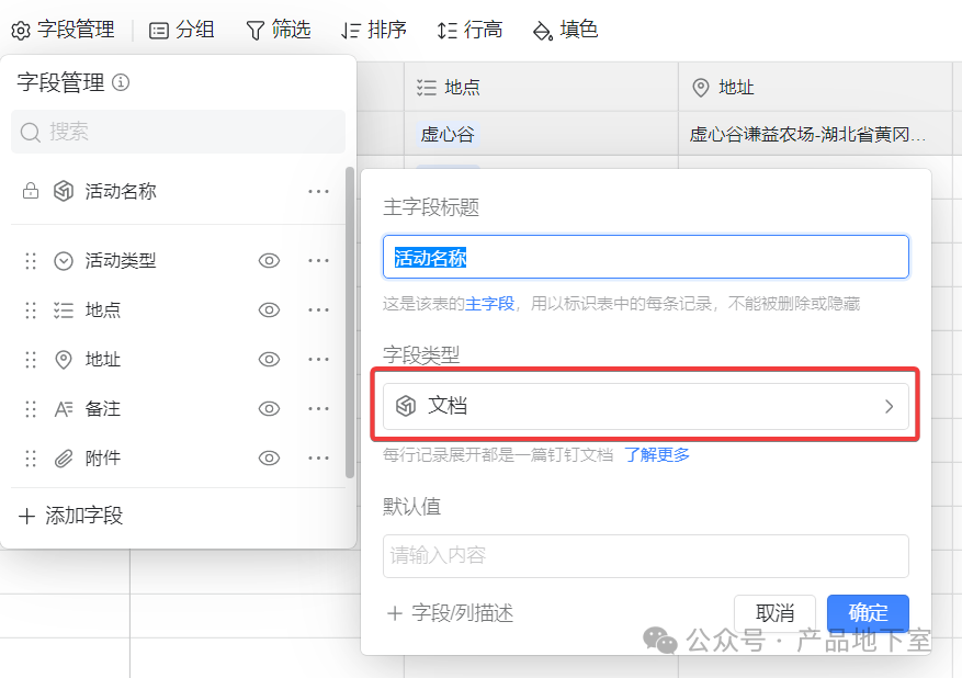 第一步:在第一个字段的字段编辑里,选择字段类型为“文档”。