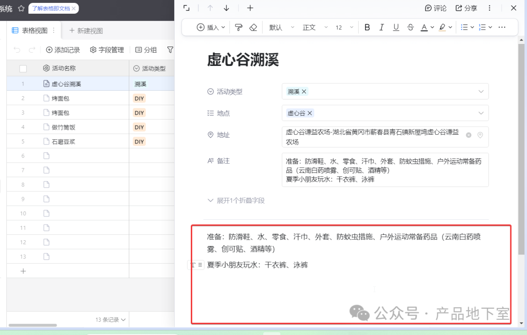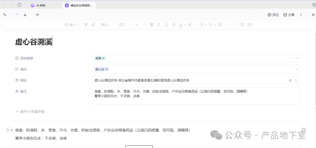 简单来说,就是将AI表格里的每一行记录都变成了一篇文档!只要展开一行记录,就可以把它当做一篇文档进行编辑(它也是一篇真正的文档)。