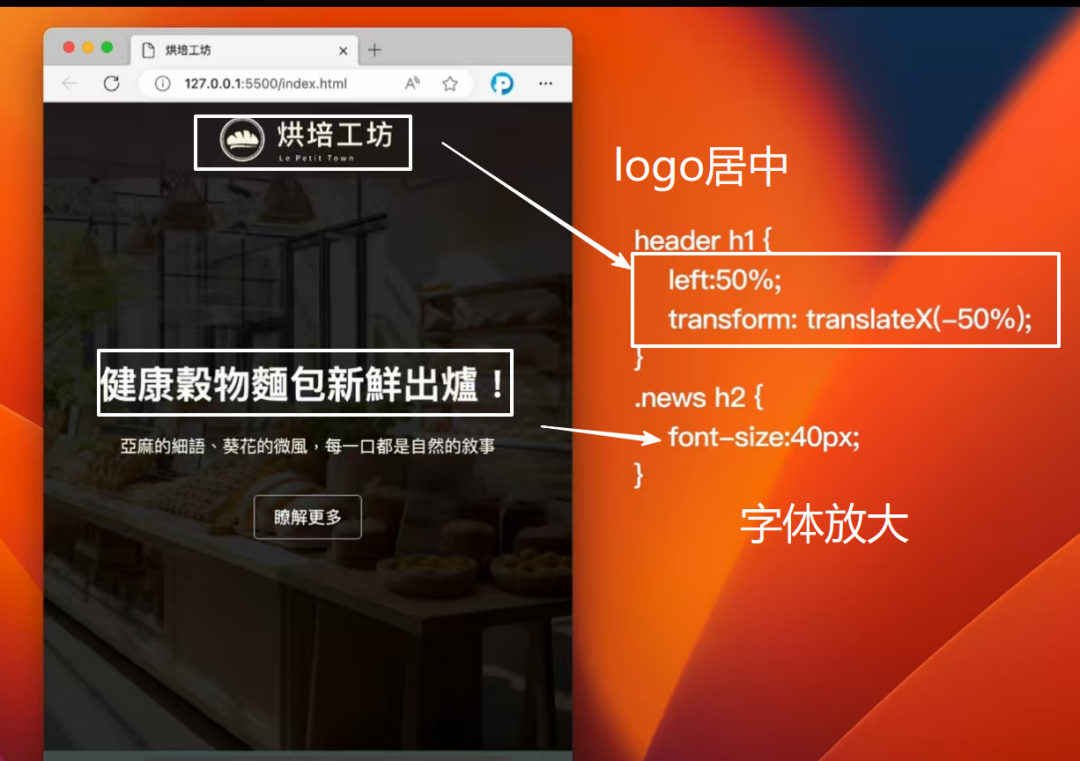 作用:实现标题元素水平居中 1. left: 50%; ◦ 将 <h1> 元素的左侧边界定位到父容器(header)的水平中心点 ◦ ✘ 仅此操作会导致元素左边缘居中,而非元素本身居中 2. transform: translateX(-50%); ◦ 关键修正:将元素向左平移自身宽度的 50% ◦ 使元素的中心点对齐父容器中心线 ◦ ✔ 实现真正的水平居中 原理示意图: