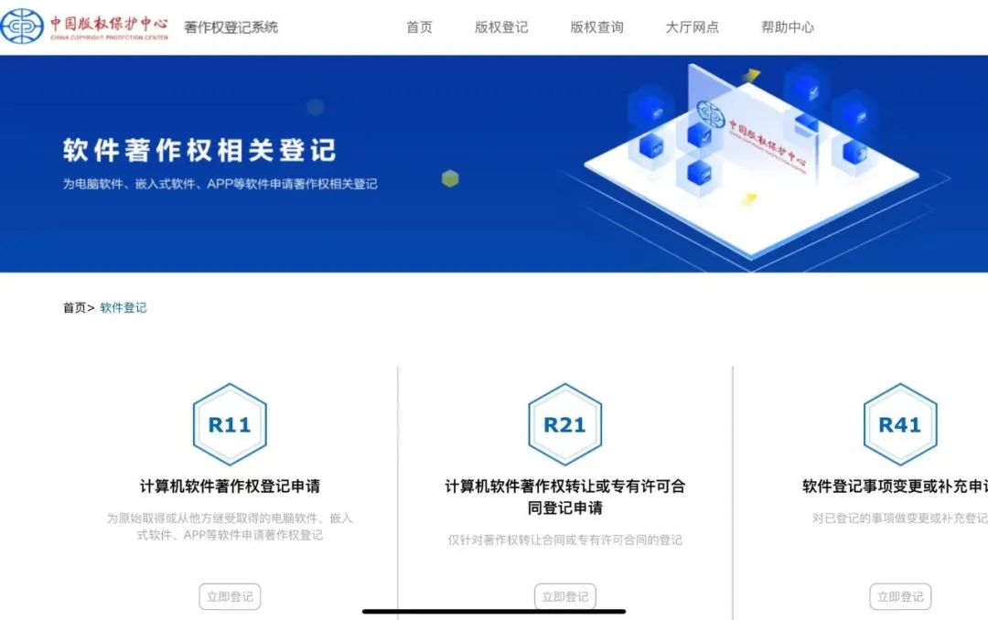 前往中国版权保护中心网站,进入软件登记页面并注册登录: