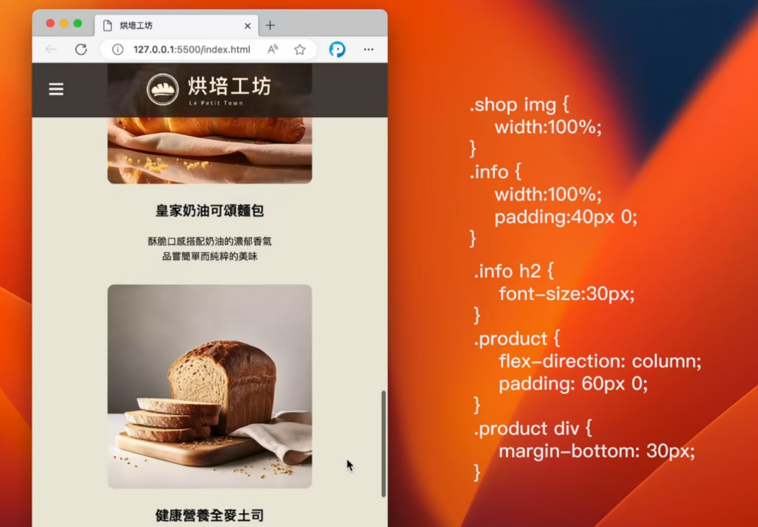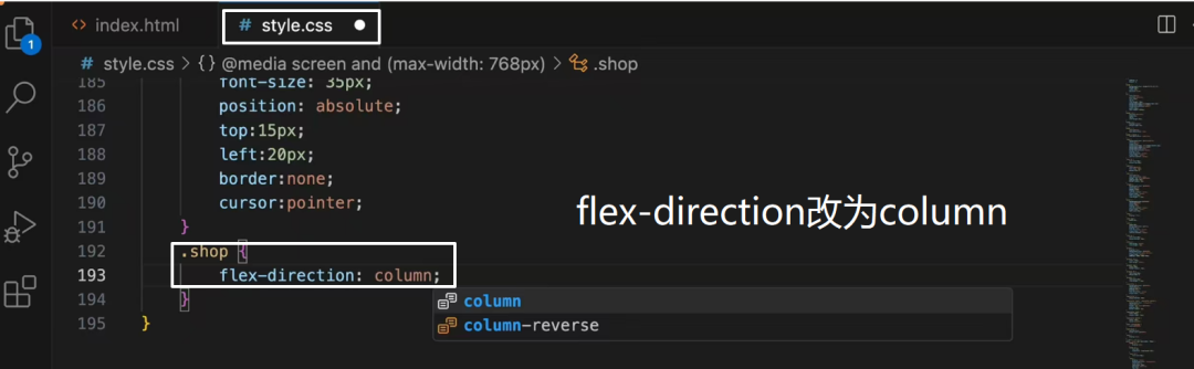 所以我们需要改变布局方式,通常从左右并排变为上下堆叠(垂直排列)。修改的方式也很简单,回到CSS样式表,把flex的排列方式改成纵向的column