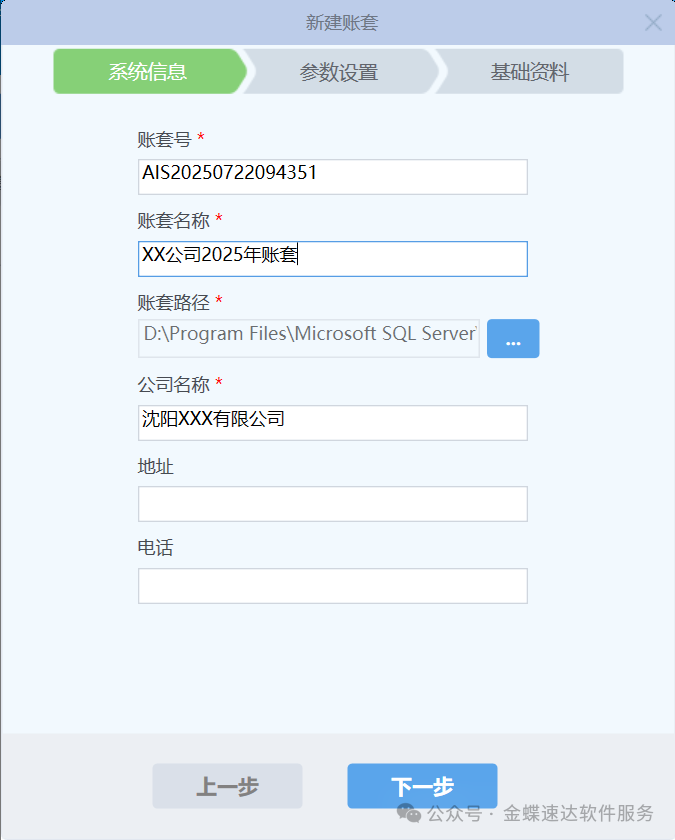 一、建账流程 1、登录【金蝶KIS云专业版—系统管理】,点击+【新建账套】 2. 【系统信息】下填写以下信息: 账套名称:建议使用公司简称(如:XX公司2025年账套); 数据库路径:选择非系统盘(如D盘)存储账套数据; 公司名称:填写全称(用于报表打印); 完成后点击【下一步】 3、【参数设置】下填写以下信息: 公司纳税性质:根据公司实际的纳税性质填写; 税率:根据公司实际的税率填写; 启用会计期间:准备启用软件的会计期间,; 本位币名称:默认人民币,支持下拉选择其他预置币别(如美元、港币); 本位币代码:本位币代码默认与币别对应; 本位币小数位:系统内所有涉及金额的计算和显示将统一采用设置的小数位,一般默认2位; 完成后点击【下一步】 完成后点击【开始建账】 阅读原文:原文链接 点晴模切ERP更多信息:http://moqie.clicksun.cn,联系电话:4001861886 该文章在 2025/7/29 12:26:22 编辑过 |