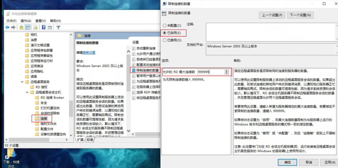 计算机配置 → 管理模板 → Windows 组件 → 远程桌面服务 → 远程桌面会话主机 → 连接