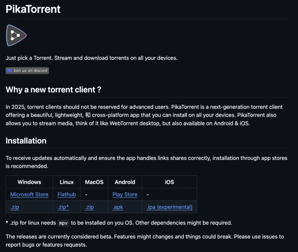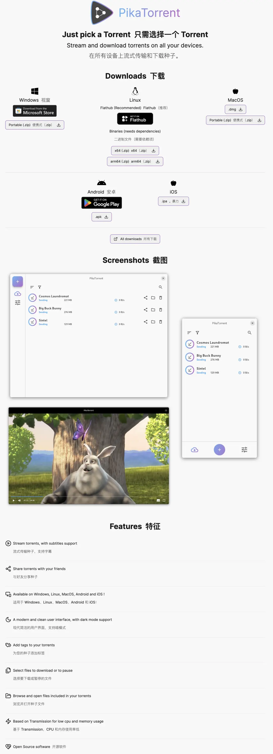 PikaTorrent 是一款开源 Torrent 客户端,只需选择一个种子文件,即可在您的所有设备上实现流式播放并下载。