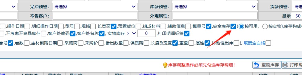点晴模切ERP-库存查询界面勾上安全库存项后行变红