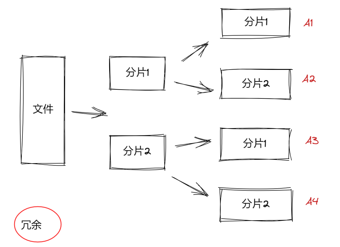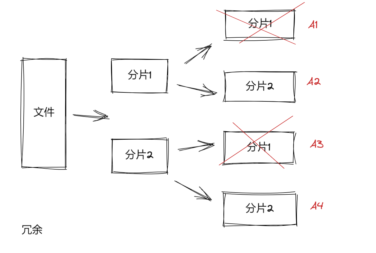此时如果使用纠删码的做法就是,A1和A2分片数据还是保持不变,A3=分片1+分片2A4 = 分片1+ 2*分片2,这样任意两份数据丢失,都可以恢复出分片1 和 分片2的数据了