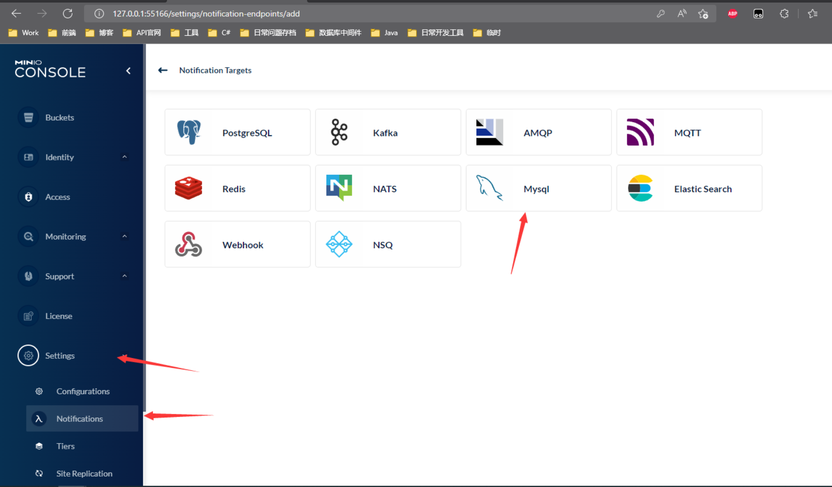 重启后控制台会给出操作Mysql的队列名arn:minio:sqs::_:mysql